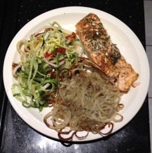 The dinner consisted of salmon, a mixed salad using the “spiralizer” and potato nests. You are most likely wondering what in the world is a “potato nest” but I got the idea from seeing a pasta nest in the grocery store and thought that the Vegetti could help me make that happen. The whole meal turned out fantastic!  and I ended up being very impressed with the Vegetti /”spiralizer”. Preparation time was only about 20 minutes and cooking time about 50 minutes. (It was a big piece of fish). I hope you try this and let me know what you think.